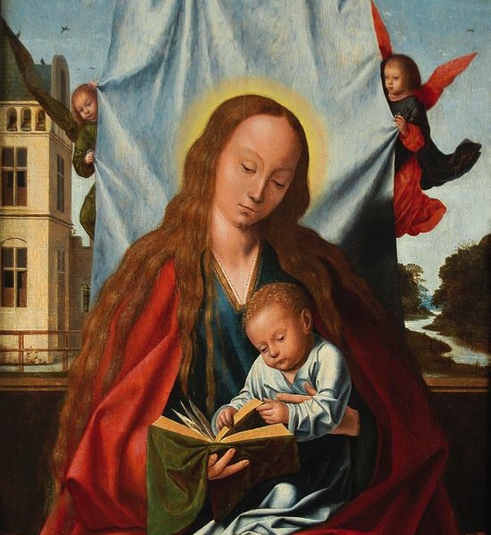 According to Friedlander, it is known that this work is by the Master of the Morrison Triptych who was a loyal follower of Quentin Massys. As of today, the artist has not been identified despite utilizing an easily recognizable pictorial character. This exquisitely executed panel represents Virgin Mary with Baby Jesus in her arms while she is showing him a book. The background of the composition has four angels, who are holding a cloth as backdrop. To the right, there is a landscape with trees and a winding river that is lost on the horizon and to the left a building. All these elements are very common and characterize Flemish primitive paintings. The use of vivid reds, blues, and greens combine with the whites, light blues, and overall give the composition a very lively tone.